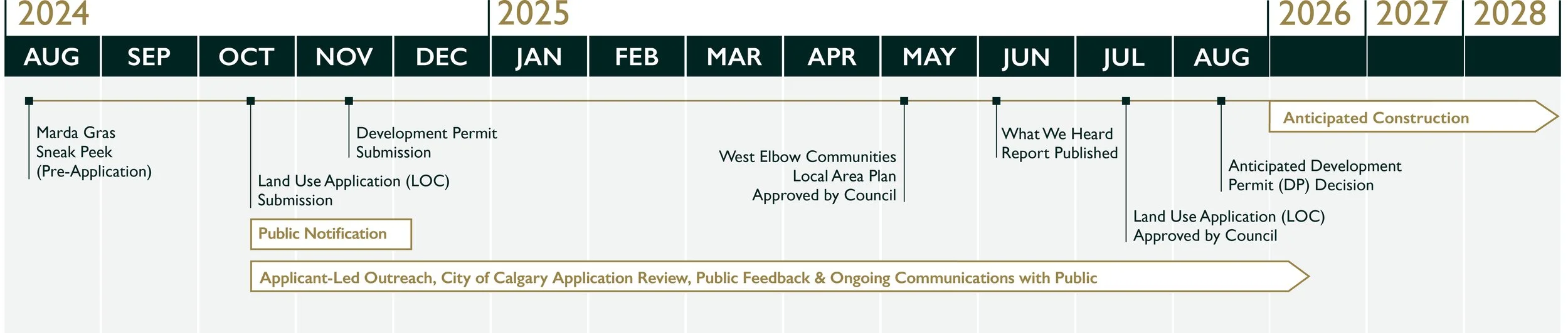The timeline represents a high-level estimate of each key milestone and may shift subject to City review processes.